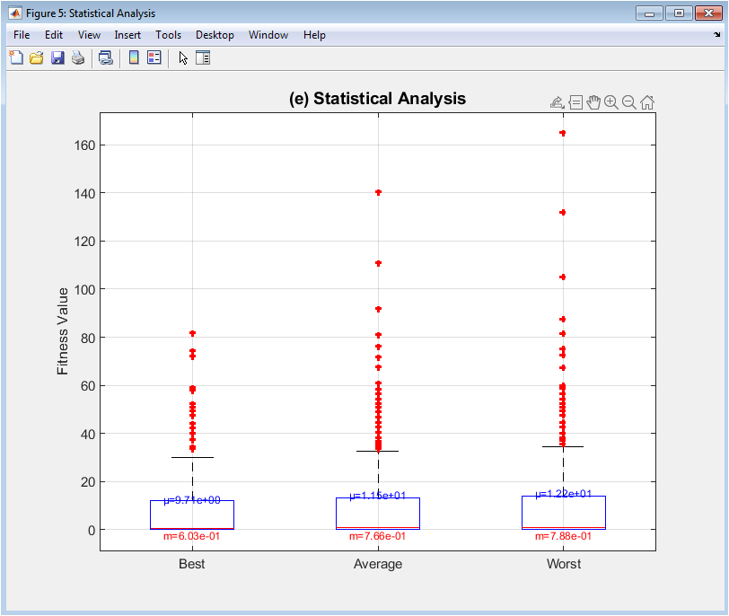 This statistical visualization summarizes the distribution of three key fitness metrics across the entire evolutionary timeline using box-and-whisker plots. Each box represents the interquartile range (middle 50%) of values for either best (left), average (middle), or worst (right) fitness across 200 generations, with the central line showing the median. Whiskers extend to non-outlier extremes, while red plus marks indicate statistical outliers. Annotated mean (μ) and median (m) values provide numerical comparison. This plot reveals stability and variability trends: a shrinking best-fitness box shows improving consistency toward the optimum; the average-fitness box indicates overall population quality stability; and the worst-fitness box highlights elimination of poor solutions. It transforms the temporal sequence into a statistical summary, facilitating comparison of algorithm behavior across different runs or parameter settings.