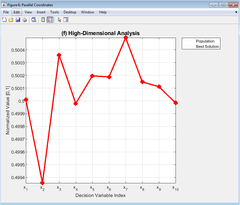 This specialized visualization overcomes the dimensionality barrier by plotting all decision variables simultaneously on parallel vertical axes, with each individual solution represented as a connected line across axes. The translucent blue lines show the entire final population, revealing correlations, clusters, and ranges across the ten-dimensional space. The bold red line highlights the best solution’s specific configuration. Normalization scales all variables to [0,1] for comparability. Patterns emerge where multiple lines follow similar trajectories, indicating variable correlations in good solutions. Gaps in the blue cloud show unexplored regions of the search space. This plot provides unique insight into high-dimensional solution structures that are invisible in lower-dimensional projections, making it invaluable for understanding complex variable interactions and verifying that the algorithm has discovered coherent, well-structured solutions rather than random points.