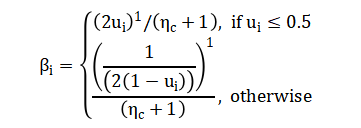 Crossover, implemented using simulated binary crossover (SBX) with distribution index generates offspring through a power-law blending: