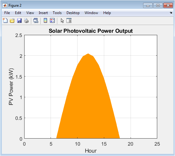 The graph visualizes the power output from the solar photovoltaic array, represented by a filled orange area under the curve. The generation profile is a direct translation of the modeled solar irradiance, assuming clear-sky conditions, resulting in a smooth, predictable curve that begins at dawn, reaches its maximum at solar noon, and returns to zero at dusk. The shape is purely deterministic, based on the sine function and the panel’s capacity and efficiency, without incorporating weather-induced intermittency in this base model. This visualization is crucial for understanding the timing and magnitude of one of the two primary renewable energy contributions to the system.