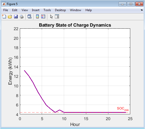 The purple line in this chart traces the energy content, in kilowatt-hours, stored within the battery over the 24-hour cycle. It dynamically responds to the balance shown in Figure 4. The red and black dashed horizontal lines clearly mark the minimum and maximum state-of-charge (SOC) limits, which are critical for preserving battery health and longevity. The plot effectively shows the battery acting as an energy reservoir, filling during periods of excess generation and emptying to cover generation shortfalls, thereby smoothing the power supply to the load.