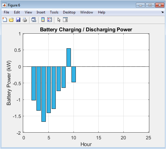 Presented as a bidirectional bar chart in teal, this figure provides a detailed account of the instantaneous power flowing into and out of the battery. Positive bars represent charging power (kW) absorbed from the renewable surplus, while negative bars represent discharging power supplied to the load. The magnitude of each bar corresponds directly to the decisions made by the energy management strategy at each time step, offering a granular view of the storage system’s active role in maintaining the real-time power balance.