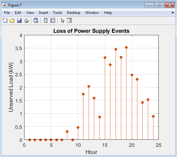 This plot uses solid red stem markers to highlight specific hours where the hybrid system failed to meet the load demand entirely. Each stem’s height represents the magnitude of the unmet load (kW) during that hour. These loss of power supply events occur when the combined renewable generation and the available energy in the battery (constrained by its minimum SOC) are insufficient. The total area under these stems is directly used to calculate the key reliability metric, the Loss of Power Supply Probability (LPSP).