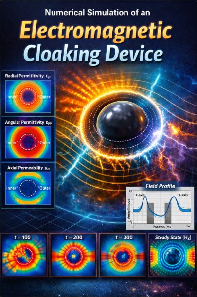 This idea, once confined to science fiction, has become theoretically feasible through the development of metamaterials and transformation optics. Transformation optics provides a mathematical framework that enables the manipulation of electromagnetic field trajectories by spatially tailoring material parameters such as permittivity and permeability. By compressing space within a defined region and guiding waves smoothly around it, a cloaking device can theoretically eliminate scattering and shadowing effects [5]. The Finite Difference Time Domain (FDTD) method has emerged as a powerful numerical tool for analyzing such complex electromagnetic structures. FDTD solves Maxwell’s curl equations directly in the time domain, allowing detailed observation of wave–material interactions [6]. In this study, a two-dimensional cylindrical cloak is modeled using radially varying anisotropic material tensors derived from coordinate transformation principles. The simulation domain is discretized into a structured grid to ensure accurate spatial resolution of electromagnetic fields [7]. A Gaussian-modulated sinusoidal source is introduced to generate propagating waves toward the cloaking structure. The interaction between the incident wave and the cloak is monitored over multiple time steps to evaluate field bending and scattering reduction [8]. Spatial maps of radial permittivity, angular permittivity, and axial permeability are implemented to represent the metamaterial shell. Time-domain field snapshots provide insight into transient wave behavior as energy flows around the cloaked region. Steady-state analysis further confirms whether the outgoing wavefront restores its original phase and amplitude characteristics. Cross-sectional field profiles are extracted to quantify the effectiveness of the cloaking performance. Numerical stability and discretization constraints are carefully maintained to ensure physical accuracy [9]. The results demonstrate how engineered material distributions can control electromagnetic energy flow. This computational approach provides a clear visualization of cloaking physics without requiring expensive experimental setups. Ultimately, the study highlights the importance of numerical modeling in advancing metamaterial-based invisibility research [10].