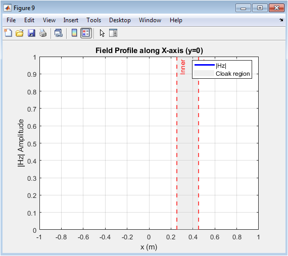 This figure shows the variation of the magnetic field amplitude along the central horizontal axis. The cloaked region appears as a zone of reduced amplitude between the inner and outer boundaries. The plot illustrates how the wavefront is restored outside the cloak. Shaded areas represent the cloak’s position for visual reference. Dashed lines indicate inner and outer boundaries. Observing this profile quantifies the effectiveness of scattering reduction along the x-axis. The figure confirms the continuity of the wave beyond the cloaked region. Peaks and troughs outside the cloak are nearly identical to the incident wave. It provides insight into field modulation caused by the metamaterial. This figure is key for evaluating directional cloaking performance.