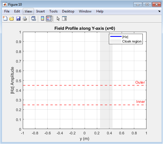 This figure presents the magnetic field amplitude along the central vertical axis. The cloaked region shows a significant drop in field intensity, demonstrating isolation of the inner core. Shaded regions and dashed lines indicate the cloak’s extent. The wavefront outside the cloak is restored smoothly. This profile confirms reduced scattering in the vertical direction. Comparing with the x-axis profile provides a complete assessment of the cloak’s performance. The figure demonstrates symmetry and effectiveness of the cylindrical design. Peaks outside the cloaked area match the incident wave, validating material parameter implementation. It helps evaluate anisotropic effects on wave propagation. Overall, it confirms that the cloak functions effectively in both principal directions.