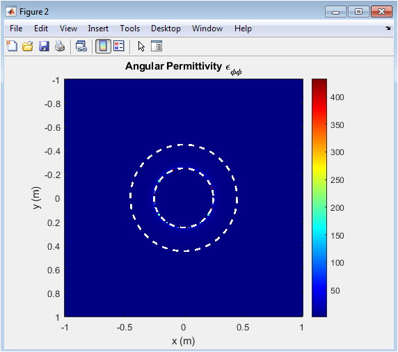 The angular permittivity figure shows how the permittivity varies along the circumferential direction of the cylindrical cloak. In the inner region, the values are uniform, while within the cloaking shell, the permittivity increases as one moves radially outward. This variation complements the radial permittivity to ensure smooth wave propagation around the hidden object. The color map provides a visual representation of the permittivity anisotropy. The inner and outer cloak boundaries are highlighted with dashed circles to indicate the cloaked region. Correct angular permittivity distribution is essential for minimizing scattering in all directions. It ensures that wavefronts maintain phase coherence after passing the cloak. The figure validates the mathematical mapping of transformation optics into the computational grid. Analyzing this figure allows assessment of potential design inconsistencies. Overall, it confirms the anisotropic material behavior required for effective cloaking.