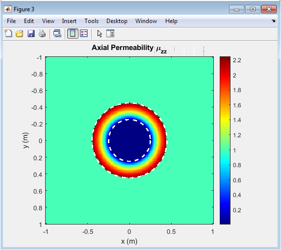 This figure visualizes the axial permeability variation across the cloaking structure. The inner region has a small permeability value to suppress field penetration, while the cloaking shell exhibits a smooth radial increase consistent with transformation optics. Axial permeability controls the magnetic response of the cloak and is crucial for bending the magnetic component of the electromagnetic wave. The color map allows observation of spatial anisotropy in the cloak. Dashed circles denote the inner and outer boundaries of the cloaked region. Correct implementation of permeability ensures reduced scattering and proper field redirection. The figure also helps identify any numerical singularities near the inner radius. By comparing with radial and angular permittivity, one can evaluate the overall cloaking effectiveness. The smooth gradient of permeability is essential for maintaining wavefront continuity. It provides a visual confirmation of the metamaterial design and ensures physical realism.