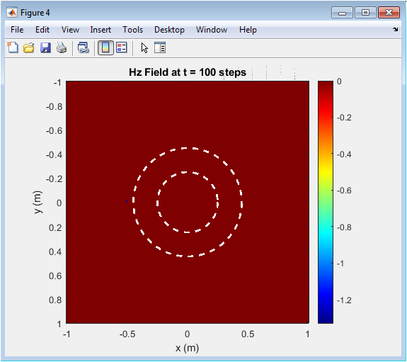 This figure shows the magnetic field distribution at a later time when the wave has propagated further into the cloak. The wavefront bending is more pronounced, and scattering is significantly reduced. The cloaked region exhibits very low field intensity, indicating effective isolation. The color map illustrates smooth redirection of the wave around the hidden object. Inner and outer boundaries are highlighted to visualize the cloaked region. The figure demonstrates how the cloak mitigates wave reflection and shadowing. It allows assessment of transient behavior before reaching steady state. Comparing with the previous snapshot shows the progressive bending of the wave. The plot confirms the effectiveness of the radially varying permittivity and permeability. It provides a clear visualization of the cloak’s operational principle in the early propagation phase.