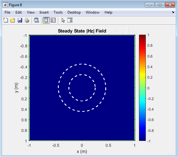 This figure represents the average magnetic field after the system reaches steady state. The cloaked region shows almost no field penetration, confirming effective isolation. The outgoing wavefront is smooth and continuous beyond the cloak. The color map visualizes field amplitude across the domain. Inner and outer boundaries highlight the cloaked region. This steady-state field validates the performance of the cloak over time. It demonstrates that wave bending and energy redirection are sustained. Minimal scattering indicates that the transformation optics parameters were implemented correctly. The figure also allows cross-sectional analysis for quantitative assessment. Overall, it provides a comprehensive view of the final cloaking effect achieved in the simulation.