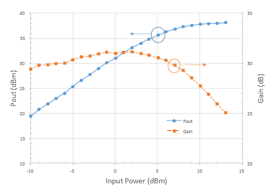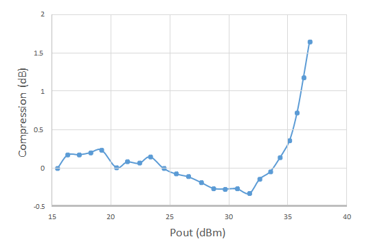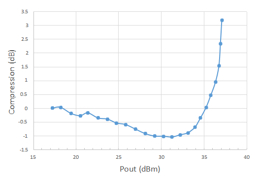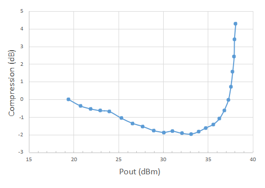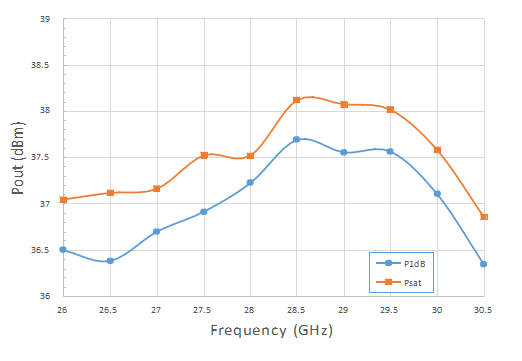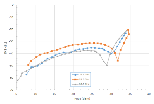 Gain compression measurements averaged over 5 devices are shown at 26.5 GHz, 28.5 GHz, and 30.5 GHz in Fig. 8, Fig. 9, and Fig. 10 respectively. All of the figures show some gain expansion followed by gain compression. Typical GaN amplifiers have soft gain compression that starts well before Psat. These plots show a quick transition from P1dB to Psat. Gain expansion can impact linearity, just as gain compression can impact linearity. The amount of impact depends on the type of modulation. A parameter such as third-order intermodulation distortion (IM3) will be sensitive to the slope of the gain with respect to input power. The gain expansion observed is modest and has a gentle slope. As a result, the sharp slope of the gain compression still dominates.