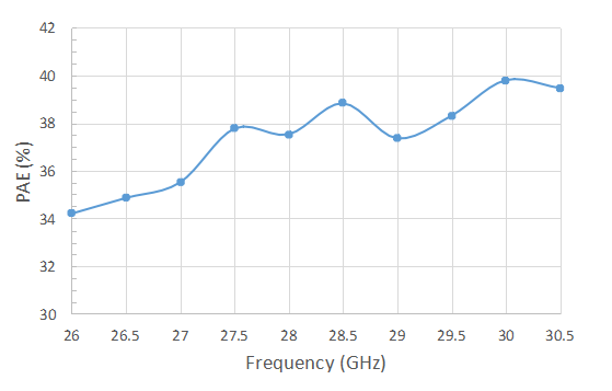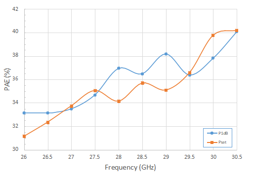 Figure 11 compares P1dB and Psat across frequency. P1dB is within 1 dB of Psat across the band, which is an excellent result for a GaN MMIC PA. The PAE for Psat and for P1dB are shown in Fig. 12. PAE at P1dB is very good across the band. PAE at P1dB is 37.8% at 30 GHz. To the authors’ knowledge, this is the highest reported PAE at P1dB for a 3-stage GaN power amplifier MMIC operating in the Ka-band.