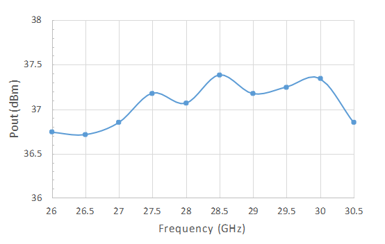 The target frequency range for the MMIC PA was 26.5- 30.5 GHz. This frequency range was selected to cover several potential 5G millimeter wave bands. Other design goals included a saturated power greater than 4 W, at least 25 dB of small-signal gain, and PAE greater than 30% over the band. In addition, low gain compression was desired for better P1dB than a typical 3-stage GaN amplifier.