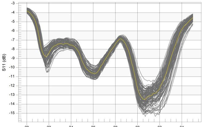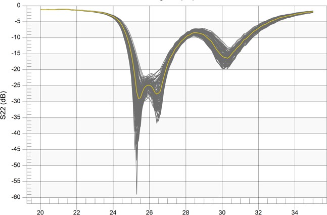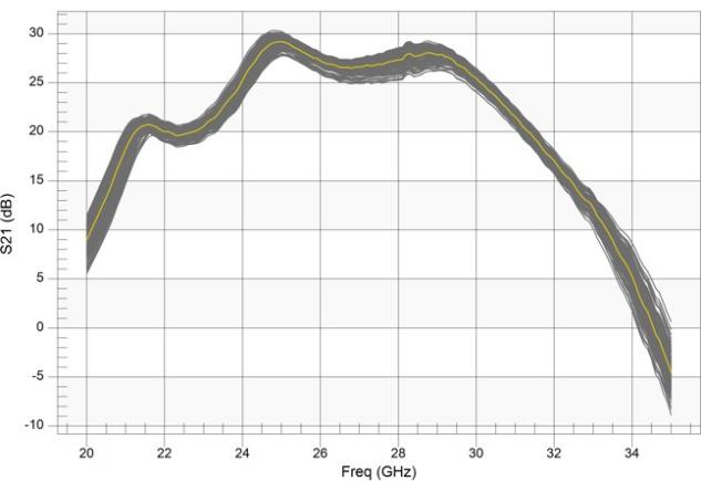 After wafer fabrication, the S-parameters are measured on- wafer. The S-parameters shown here are measured on 120 devices across a wafer. The yellow line represents the mean of