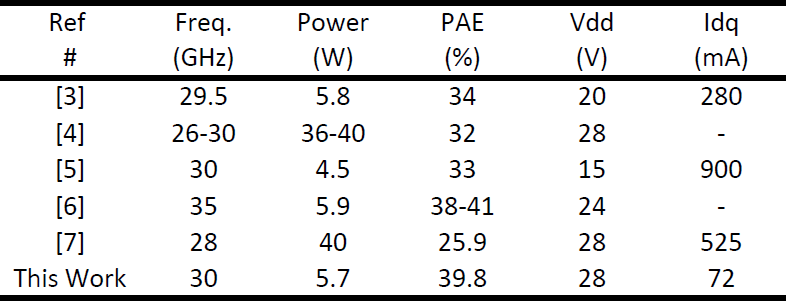 Figure 6 shows output power (Pout) at maximum PAE over the band, and the corresponding maximum PAE is shown in Fig. 7. The 4 W output power and 30% PAE goals have been exceeded.PAE is excellent across the band and approaches 40% at 30 GHz. The PAE measurements compare very favorably with previously published results. A comparison of power and PAE to previously published work is shown in Table 1. [3-7]