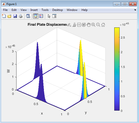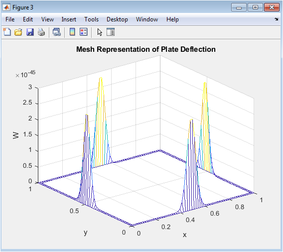 The mesh plot provides a wireframe view of the plate’s deformation, showing both displacement magnitude and surface geometry. The intersections of grid lines reveal the discretization used in the finite difference scheme. Peaks at the center correspond to maximum bending, while the edges remain at zero displacement. The wireframe emphasizes curvature along both (x) and (y) directions, highlighting the biharmonic nature of the plate equation. It allows visualization of both primary and secondary bending modes. The grid structure also indicates the spatial resolution of the simulation. Mesh plots are useful for assessing numerical smoothness and identifying possible artifacts or irregularities. By viewing the plate from different angles, one can observe the undulating deformation pattern. This representation helps in comparing simulated and theoretical mode shapes. Overall, the mesh plot is a compact and informative way to depict dynamic plate behavior.