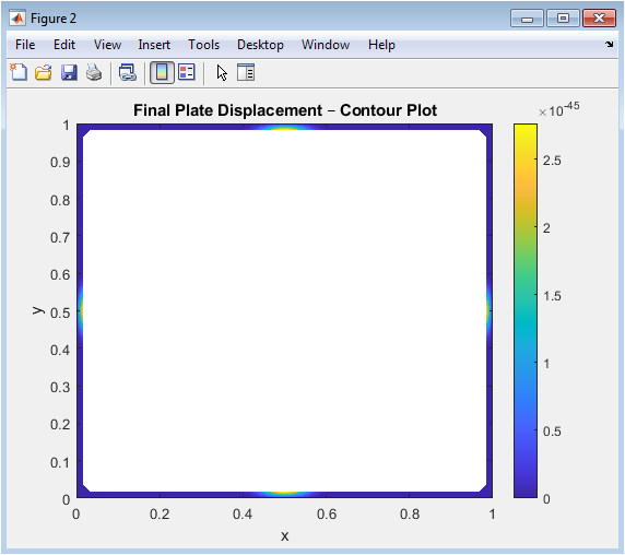 The contour plot represents displacement levels as color-coded contours across the plate surface. Each contour line indicates a specific deflection value, allowing visualization of the bending gradient. The central region shows the highest deflection, gradually decreasing toward the simply supported edges. Symmetry about both axes confirms the proper application of boundary conditions. This plot emphasizes local variations in curvature and identifies regions of high bending stress. Contour density is higher near the load, indicating sharper displacement gradients. It provides a clear overview of mode shapes and how energy propagates through the plate. Unlike the surface plot, the contour view isolates deflection levels, enhancing interpretability. This visualization is particularly useful for structural analysis and identifying critical regions. Overall, it complements the 3D surface plot by providing a planar view of the dynamic response.