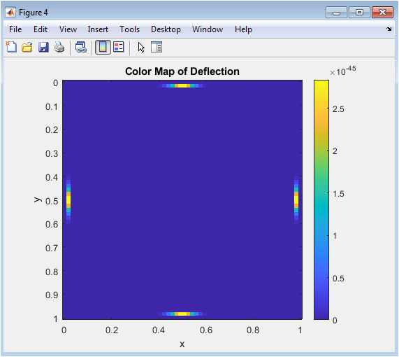 The color map represents the magnitude of plate displacement using color intensity, providing an immediate visual assessment of high and low deflection areas. Bright colors indicate maximum deflection at the plate center, while darker tones correspond to zero displacement at edges. This plot emphasizes spatial gradients of deformation more clearly than surface plots. The simply supported boundary condition is evident as a uniform zero-displacement region along edges. The Gaussian load generates a smooth transition in deflection intensity from center to edges. The plot aids in identifying critical regions where bending stress is concentrated. It also allows quick comparison between different plate designs or loading conditions. This visualization is particularly effective for conveying results in publications or presentations. Overall, the color map complements other plots by focusing on displacement magnitude rather than surface shape.