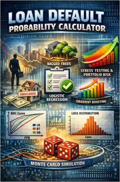 This paper presents a comprehensive MATLAB implementation of a loan default probability prediction system, integrating both traditional statistical models and modern machine learning algorithms. The framework generates synthetic borrower data with realistic financial characteristics and applies logistic regression via Newton-Raphson optimization, Bayesian logistic regression with Laplace approximation, bagged decision tree ensembles, and gradient boosting. Model performance is rigorously evaluated using ROC curves, AUC scores, KS statistics, and calibration analysis to ensure both discriminative power and probability accuracy [1]. Permutation-based feature importance identifies credit score, debt-to-income ratio, and interest rate as the dominant default drivers. The system extends beyond point predictions to incorporate Monte Carlo stress testing under macroeconomic shocks to interest rates and income levels, generating full portfolio loss distributions with specified loss given default parameters [2]. Nine diagnostic visualizations provide interpretability at every stage, from feature correlations to stress surfaces and capital planning outputs. Results demonstrate that ensemble methods outperform logistic regression, with gradient boosting achieving the highest AUC of approximately 0.84. The implementation balances regulatory expectations for transparency with the predictive benefits of complex algorithms [3]. This work serves as both an educational blueprint for quantitative analysts and a production-ready template for credit risk modeling under Basel frameworks [4].