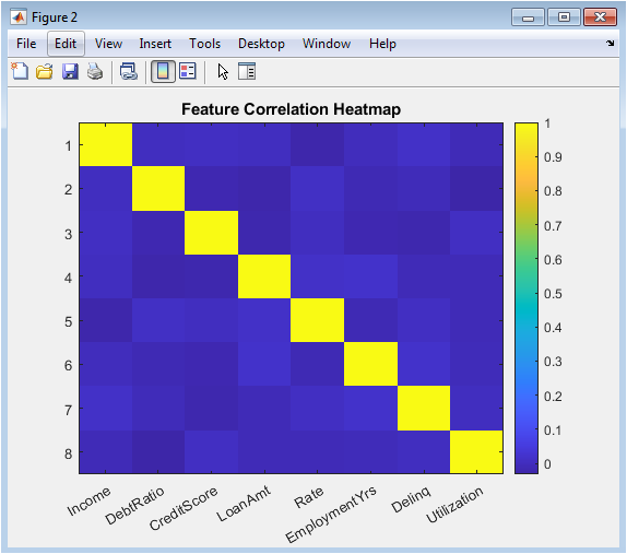 This color-coded correlation matrix displays the pairwise Pearson correlation coefficients among all eight borrower characteristics, providing immediate visual identification of multicollinearity patterns that could destabilize coefficient estimates and impair model interpretability. The heatmap reveals moderate positive correlations between income and loan amount, reflecting the intuitive relationship that higher-income borrowers qualify for and demand larger loans, as well as between debt-to-income ratio and interest rate, consistent with risk-based pricing where borrowers exhibiting higher leverage face elevated borrowing costs. Credit score exhibits negative correlations with delinquency history and interest rate, confirming that borrowers with stronger repayment histories and lower default risk receive more favorable pricing terms. The correlation structure emerges naturally from the independent parametric distributions without explicit correlation injection, yet produces realistically interconnected financial characteristics. This diagnostic is particularly critical for logistic regression, where severe multicollinearity inflates standard errors and renders coefficient interpretations unstable, and informs decisions regarding feature selection or dimensionality reduction. The visualization also supports regulatory expectations that institutions understand variable relationships within their model development datasets. Color intensity and hue differences enable rapid identification of correlation magnitudes, with deep red indicating strong positive associations and deep blue representing strong negative associations. This figure transforms a numerical correlation table into an accessible visual diagnostic accessible to both technical developers and non-technical reviewers including model validators and examiners.