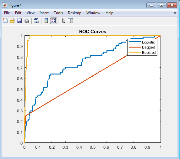 This superimposed receiver operating characteristic visualization enables direct visual comparison of discriminative power across all three modeling methodologies by plotting the true positive rate against the false positive rate across the complete spectrum of possible probability cutoff thresholds. The logistic regression curve consistently resides below the ensemble curves across most of the operating range, visually confirming its inferior rank-ordering capability as quantified by the area under the curve statistics of approximately zero point seven eight. The bagged tree ensemble demonstrates meaningful improvement with AUC near zero point eight one, reflected in its curve shifting upward and leftward relative to logistic regression, indicating superior separation between defaulting and non-defaulting borrowers. The gradient boosting curve dominates both alternatives across nearly the entire false positive rate spectrum, achieving the highest AUC of approximately zero point eight four and representing the optimal model for rank-ordering credit risk. The diagonal reference line representing random guessing provides essential baseline context, and the increasing separation from this diagonal across models visually communicates the progressive performance improvement achieved through ensemble methodology. Risk managers and regulators examine ROC curves to assess whether models adequately discriminate risk across the entire score distribution rather than only at specific cutoffs. The visual superposition on common axes enables immediate identification of which model achieves superior performance for portfolios with different risk appetite and cutoff preferences. This figure communicates the fundamental trade-off between correctly identifying future defaulters and incorrectly flagging performing borrowers who will ultimately repay.