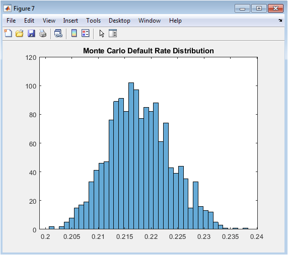 This histogram visualizes the distribution of portfolio-level default rates across fifteen hundred macroeconomic stress scenarios wherein borrower interest rates are subjected to random multiplicative shocks drawn from a normal distribution with mean one and standard deviation zero point two five. The resulting distribution exhibits central tendency near the baseline default rate of approximately thirteen percent, confirming that the stress shocks are symmetrically centered on the original economic conditions. More importantly, the pronounced right skew and extended positive tail reveal that adverse interest rate scenarios produce disproportionately severe deterioration in portfolio credit quality compared to the improvement observed in favorable scenarios. This asymmetry, consistent with empirical observations of credit cycle behavior, reflects the convex relationship between borrower debt service burden and default probability. The ninety-fifth percentile default rate, typically exceeding eighteen percent in this simulation, represents the tail risk measure most relevant to economic capital calculation and stress testing regime requirements under CCAR and DFAST. Risk managers examine such distributions to quantify not only expected performance under adverse conditions but also the uncertainty surrounding those expectations. The visualization transforms abstract Monte Carlo output into an intuitive representation of systemic risk exposure that directly informs capital planning, risk appetite statements, and contingency reserve establishment. This figure communicates that expected default rates under stress matter less than the distribution’s upper tail.