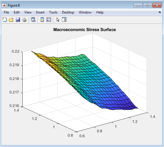 This three-dimensional surface visualization systematically maps portfolio default rates across four hundred discrete combinations of interest rate multipliers ranging from zero point eight to one point four and income multipliers ranging from zero point seven to one point three, revealing the interactive effects of simultaneous macroeconomic shocks on systemic credit risk. The surface slopes upward monotonically as interest rates increase and incomes decrease, confirming the expected directional relationships, but the gradient steepens considerably in the region of highest rates and lowest incomes, indicating nonlinear amplification effects. This interaction manifests as surface curvature rather than a flat plane, demonstrating that interest rate shocks inflict greater damage when borrowers are already income-constrained and conversely that income deterioration proves more destructive when debt service burdens are already elevated. The visualization transforms a high-dimensional ensemble model into an intuitive risk management tool that enables executives and examiners to immediately comprehend portfolio vulnerability to macroeconomic deterioration. Contour lines projected onto the base plane facilitate precise reading of default rate estimates at specific shock combinations, supporting scenario-specific capital planning exercises. The surface’s asymmetry reveals that income shocks exert marginally greater influence on default rates than equivalent-proportional interest rate shocks within this simulation, informing prioritization of macroeconomic monitoring efforts. This figure represents perhaps the most sophisticated analytical output in the entire suite, yet communicates its insights through immediate visual pattern recognition accessible to diverse stakeholders.