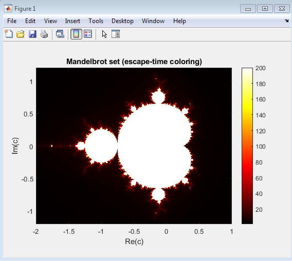 Above figure presents the Mandelbrot set, a classic example of a mathematical fractal generated by iterating the complex quadratic function , where both and are complex numbers. Each pixel in the image corresponds to a unique complex value of . Starting from , the equation is repeatedly applied for up to 200 iterations. The behavior of the sequence determines whether the point belongs to the Mandelbrot set. If the magnitude remains less than or equal to 2 for all iterations, the point is considered stable and part of the set. Otherwise, it diverges. The escape-time algorithm is used to assign color values to each point based on how quickly the magnitude exceeds 2. Points that remain bounded are typically colored black, while those that diverge are shaded according to their escape iteration count, producing the glowing red-to-yellow gradient seen in the figure. This visualization was generated using MATLAB’s imagesc() function and the hot colormap, which enhances the contrast between stable and unstable regions.
