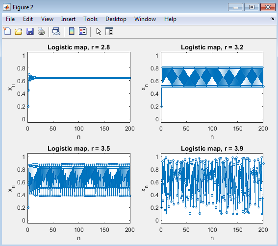 Investigate the dynamic behavior of a nonlinear system using the logistic difference equation. Procedure of the equation is iteratively solved for different values of (2.8, 3.2, 3.5, 3.9).The initial condition is used for all simulations, and each iteration runs for 200 steps. MATLAB’s plot() function is used to visualize the evolution of over time for each .The resulting plots demonstrate transitions from steady-state behavior to oscillations and finally chaotic fluctuations as increases. Result of the logistic map illustrates how a simple nonlinear equation can produce diverse dynamics from stable equilibrium to chaotic oscillation depending on the system’s control parameter .