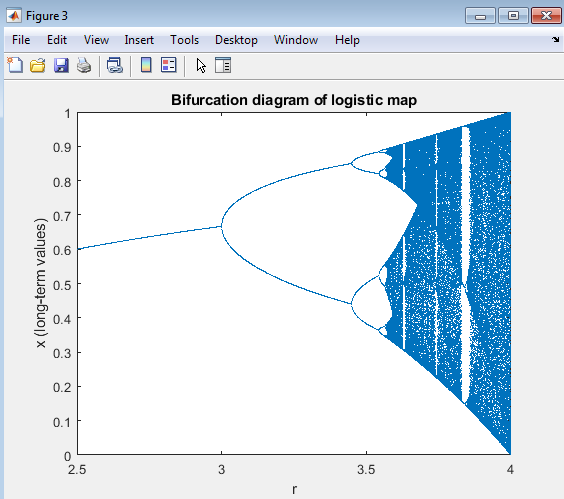 Above figure  provides a comprehensive visualization of the bifurcation behavior of the logistic map, one of the most important graphical tools in chaos theory. This diagram represents how the long-term population value in the logistic equation changes as the growth parameter varies continuously between 2.5 and 4.0. It demonstrates how a simple nonlinear difference equation can exhibit an astonishing range of behaviors  from stable equilibrium to fully chaotic motion  depending on a single parameter. In this simulation, MATLAB computes 2000 different values of and iterates the logistic map 1200 times for each value. The first 1000 iterations are ignored to eliminate transient effects, and the final 200 iterations are plotted on the graph. Each dot in the figure represents a stable value of that the system reaches after the transient phase. When is small (around 2.5 to 3.0), all points collapse into a single line, indicating a stable fixed point where the system settles at one steady population level. As increases beyond 3.0, the single branch splits into two of  a period-doubling bifurcation  meaning the population now oscillates between two distinct values in successive iterations. With further increases in , these oscillations double again, producing four, eight, sixteen, and so on, until the system enters a region of chaotic motion near .Beyond this point, the diagram becomes densely populated with points, signifying the onset of chaos, where the population no longer follows a predictable pattern. However, even within this chaotic regime, periodic windows appear  narrow bands where the system temporarily regains order and oscillates with a fixed number of states before returning to chaos. These windows of order within chaos (for example, around ) illustrate the intricate structure of nonlinear systems, where stability and unpredictability coexist. The bifurcation diagram, plotted using MATLAB’s plot() function with a very fine step size, beautifully captures the route to chaos the process by which regular, periodic behavior transitions into irregular, unpredictable dynamics through successive bifurcations
