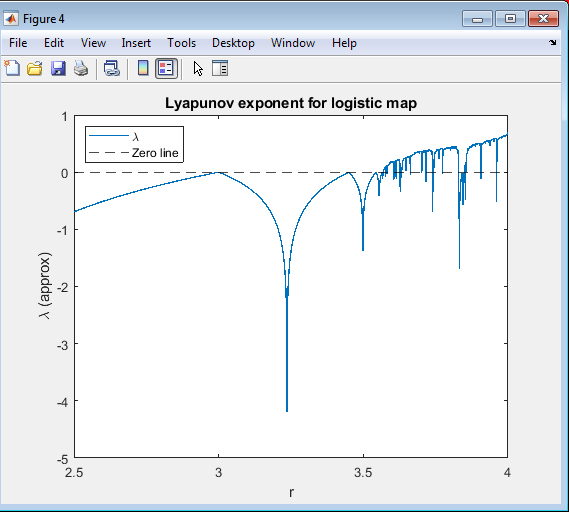 Above figure presents the Lyapunov exponent spectrum of the logistic map, a powerful quantitative measure that distinguishes between stable, periodic, and chaotic behaviors in nonlinear systems. The Lyapunov exponent () measures the average rate of divergence or convergence between nearby trajectories in a dynamical system. In simpler terms, it tells us how sensitive a system is to small changes in initial conditions the defining feature of chaos. For this simulation, MATLAB computes the Lyapunov exponent for 2000 evenly spaced values of the control parameter , ranging from 2.5 to 4.0. For each , the logistic equation is iterated many times, with initial transients discarded. If the value of is negative, nearby trajectories converge over time, meaning the system is stable or periodic. When is zero, the system is on the verge of instability  a bifurcation point. However, if becomes positive, small differences in initial conditions grow exponentially, indicating chaotic behavior. In the figure, the horizontal dashed line at acts as a boundary between order and chaos. For lower values of (below approximately 3.0), the Lyapunov exponent remains negative, confirming stable dynamics. As increases and the system undergoes period-doubling bifurcations, approaches zero, marking the transition to instability. Beyond , becomes positive, indicating that the system has entered a chaotic regime where long-term prediction becomes impossible despite the deterministic nature of the equation. Interestingly, small dips in the positive region correspond to periodic windows, where the system temporarily regains stability before returning to chaos. This figure is an essential complement to the bifurcation diagram , as it provides a numerical verification of chaos. While the bifurcation plot shows the qualitative pattern of system behavior, the Lyapunov spectrum quantifies it precisely. Together, they demonstrate that the onset of chaos in the logistic map occurs exactly where crosses zero. The MATLAB implementation uses loops and logarithmic calculations to evaluate the exponent efficiently, and the results are plotted with a clear distinction between stable and chaotic regions. Overall above provides deep insight into the mathematical nature of chaos, showing how deterministic equations can exhibit unpredictable and divergent outcomes. It reinforces one of the most profound principles of nonlinear dynamics that chaos is not randomness, but rather an inherent property of deterministic systems that are highly sensitive to initial conditions.