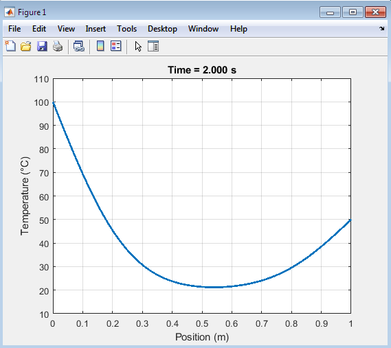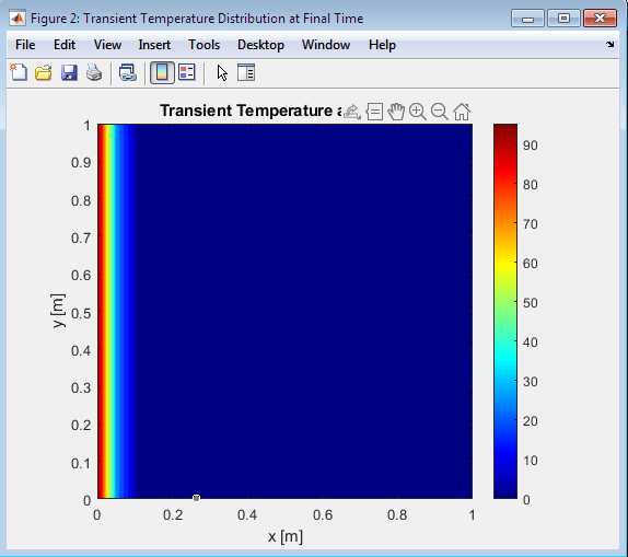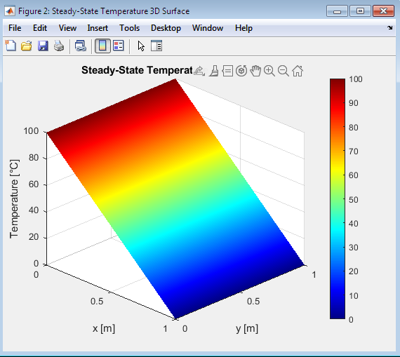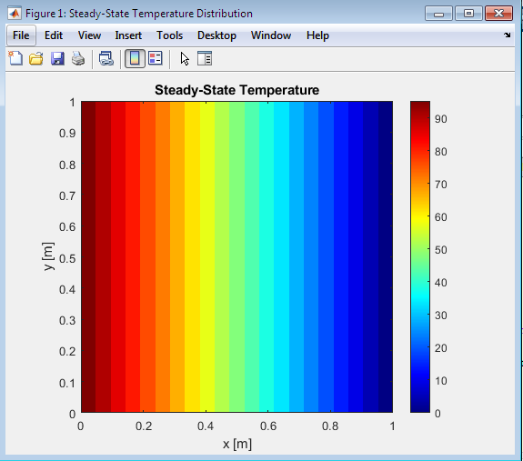 In the steady-state scenario, the temperature distribution is time-invariant, meaning that the system has reached thermal equilibrium. The MATLAB implementation solves the simplified form of the heat conduction equation, which reduces to a set of algebraic equations under fixed boundary conditions.[5] The solution typically exhibits a linear temperature gradient between the boundaries in one-dimensional problems, consistent with classical analytical results.The steady-state model is computationally efficient and suitable for problems where thermal conditions remain constant over time. However, it cannot capture the dynamic response of systems subject to changing thermal loads or initial temperature distributions.