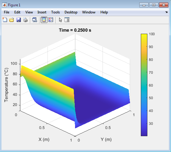 Above plot shows the two-dimensional heat equation using an explicit finite difference scheme. The script first defines the parameters of the problem, including the length and width of the plate (Lx = 1 m and Ly = 1 m), the number of grid points in the x and y directions (nx = 40 and ny = 40), the thermal diffusivity (alpha = 0.01 m²/s), the time step (dt = 0.0005 s), and the number of time steps (nt = 500). The script checks the stability condition for the explicit scheme, ensuring that the sum of the Fourier numbers in the x and y directions (r_x and r_y) does not exceed 0.5. If the stability condition is violated, the script throws an error. The script then initializes the temperature field, setting the initial temperature to 20°C throughout the plate, and applies Dirichlet boundary conditions to the edges of the plate. A 3D surface plot is created to visualize the temperature distribution, and the script enters a time-stepping loop. Inside the loop, the script updates the internal points of the temperature field using the explicit finite difference scheme, which approximates the spatial derivatives using central differences. The temperature field is updated at each time step, and the plot is updated every 10 time steps to visualize the evolution of the temperature distribution over time. The resulting animation shows how the temperature distribution changes as the plate heats up or cools down, with the edges of the plate maintained at fixed temperatures. The script uses the draw now command to update the plot and create the animation, and the title function is used to display the current time in the simulation. The explicit finite difference scheme used in this script is a simple and efficient method for solving the heat equation, but it requires careful selection of the time step to ensure stability.