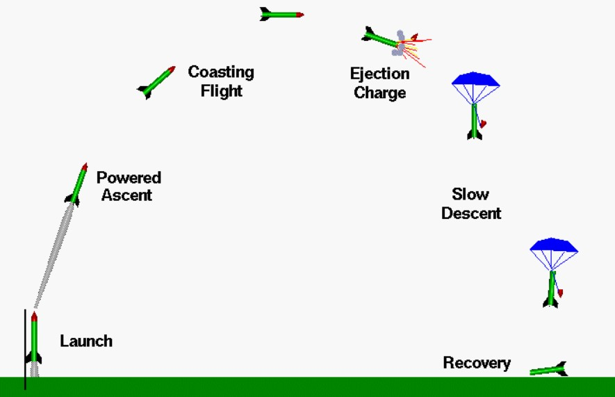 As the rocket begins to fall back towards the ground, a delay charge burns, followed by a second charge that deploys the parachute. The parachute slows down the rocket’s descent, allowing it to land safely. The parachute deployment marks the final stage of the rocket’s flight.