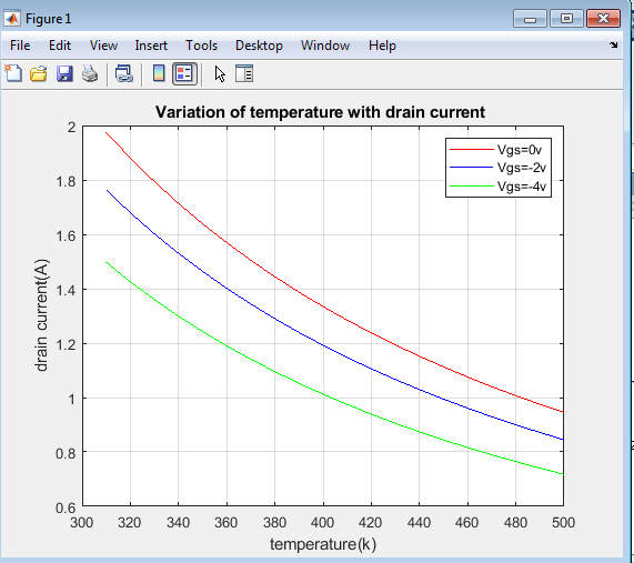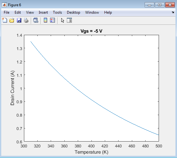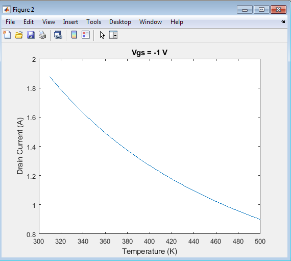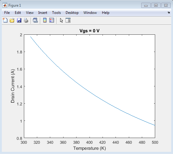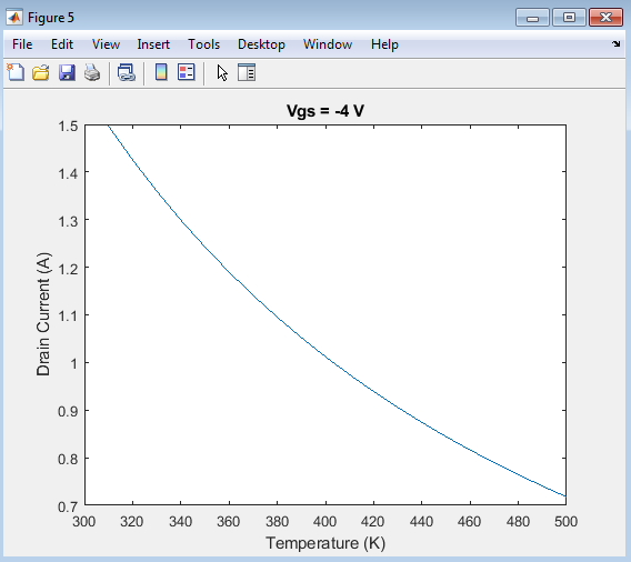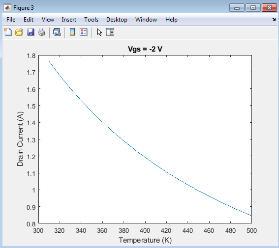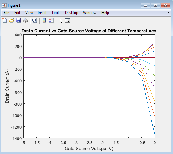 For each temperature, the simulation loops over a range of gate-source voltages, calculating the drain current at each voltage using the gate-source voltage-dependent equation.