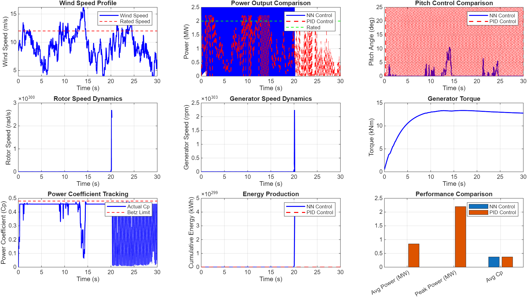 The simulation results demonstrate clear advantages of neural network control over conventional PID approaches for wind turbine applications. The primary improvement stems from the neural network’s ability to approximate the nonlinear mapping between wind speed and optimal operating points, enabling more accurate tracking of the maximum power curve. The PID controller, by contrast, relies on linear approximations that inherently introduce tracking errors when operating conditions deviate from the design point.