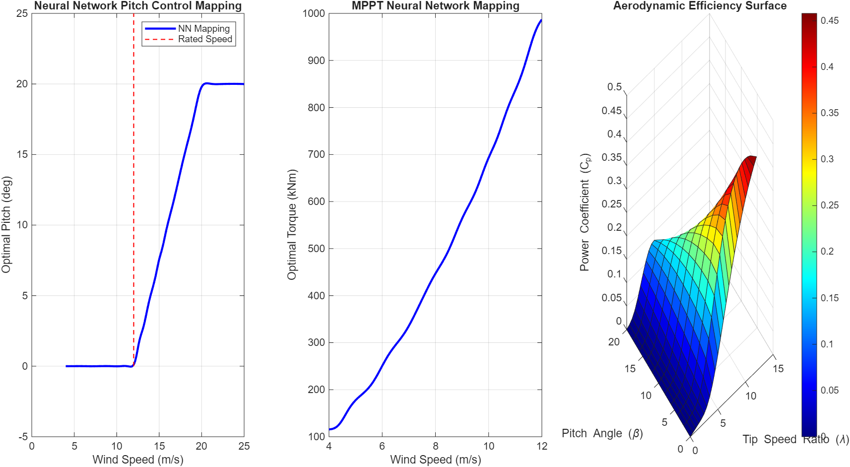 The operating points subplot presents a three-dimensional scatter plot showing the relationship between wind speed, rotor speed, and pitch angle, with colors representing power output. This visualization demonstrates how the neural network controller explores and maintains operation near the optimal surface. The concentration of points near the optimal tip speed ratio line confirms that the MPPT neural network effectively tracks maximum power conditions. During high wind conditions, the increased pitch angles demonstrate the controller’s ability to transition smoothly to power limitation mode.