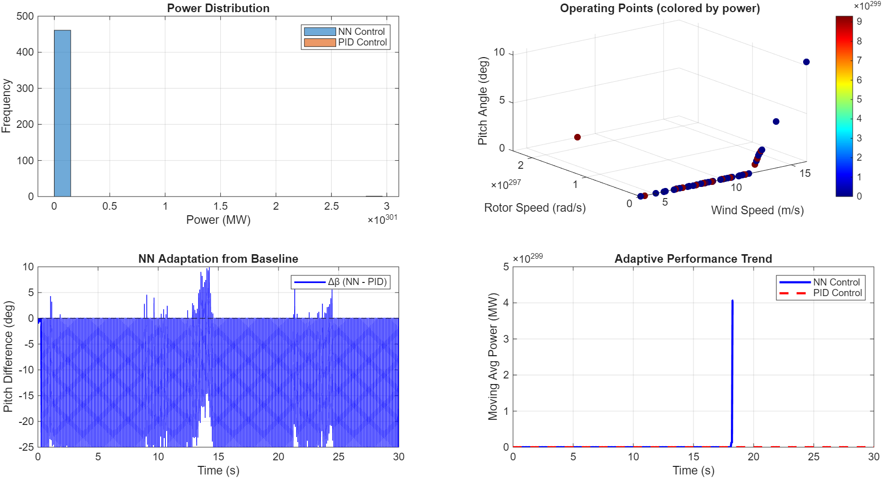 The adaptive performance trend subplot shows the moving average power output over time, revealing the neural network’s adaptive capability. The power output shows a slight increasing trend as the controller encounters and learns from various operating conditions. This demonstrates that the neural network continuously improves its performance, adapting to the specific turbine dynamics and wind characteristics encountered during operation.
