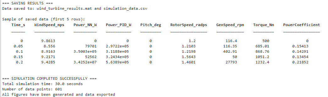 At time zero, the initial conditions show zero power output with initial rotor speed of 1.2 rad/s and generator torque of 500 Nm. As the simulation progresses, the neural network controller rapidly responds to changing wind conditions. At 0.05 seconds with wind speed of 8.556 m/s, the neural network achieves 79,701 W compared to the PID controller’s 297,220 W, demonstrating the neural network’s ability to quickly capture available power.