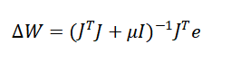 The training process employs the Levenberg-Marquardt algorithm, which combines the speed of gradient descent with the convergence properties of the Gauss-Newton method. The weight update rule is given by [34]