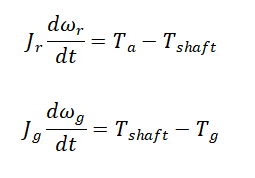 where J_r and J_g represent the moments of inertia of the rotor and generator respectively, ω_g is the generator angular velocity, and T_g is the electromagnetic torque applied by the generator.
