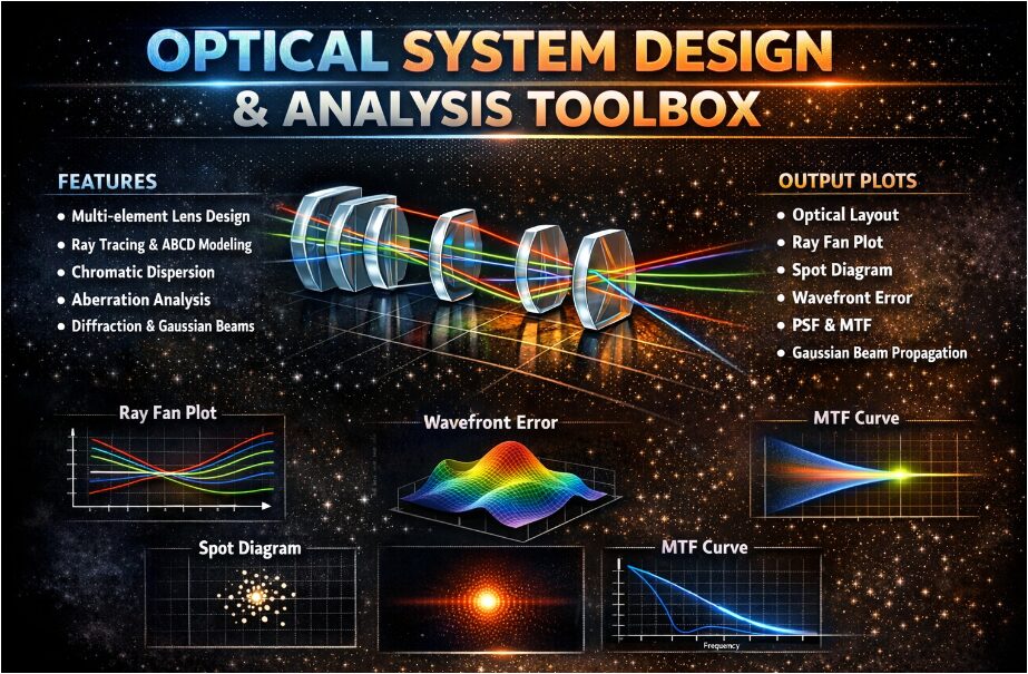 The core problem in optical system development is the significant gap between theoretical lens design principles and their practical, accessible implementation for performance analysis. While commercial software exists, its high cost and opaque “black-box” nature hinder fundamental understanding and limit access for students, researchers, and engineers with budget constraints. This creates a critical need for a transparent, integrated computational tool that can seamlessly transition from geometric ray tracing and aberration calculation to wave-optical diffraction analysis and system-level metrics like MTF. Specifically, there is a lack of free, comprehensive frameworks that unify ABCD matrix modeling, exact multi-surface ray tracing, chromatic and Seidel aberration estimation, spot diagram generation, wavefront error computation, and diffraction-based PSF/MTF derivation within a single, modifiable environment. This absence impedes effective learning, rapid prototyping, and deeper insight into the direct connections between optical design choices and final image quality.