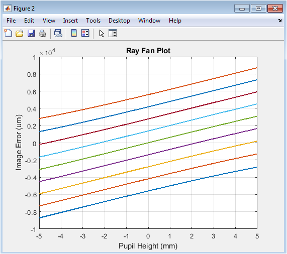 This figure shows the physical layout of the optical system with lens surfaces drawn as circular arcs according to their specified radii and positions. Multiple rays are traced from object space at different field angles, bending at each refractive interface according to Snell’s law. The central (on-axis) and extreme off-axis ray bundles are displayed, illustrating how rays converge toward the image plane. The visualization allows immediate verification of the system geometry, showing clear paths through the doublet lens configuration. It demonstrates whether rays physically clear the lenses and how they approach focus. The plot provides an intuitive understanding of the system’s first-order behavior and physical constraints, serving as a fundamental sanity check for the optical design before more detailed analysis.