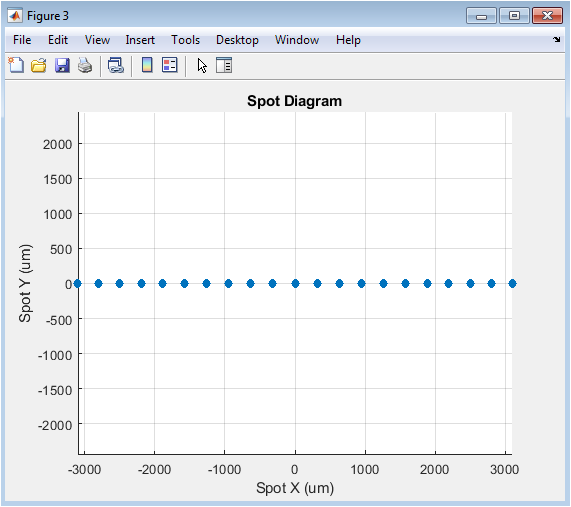 This spot diagram displays the geometric intersection points of multiple traced rays from a single object point at the image plane. In an ideal system, all rays would converge to a single point, but real systems show spreading due to aberrations. The size and shape of the spot cluster directly indicate geometric image quality – a smaller, symmetric spot suggests better performance. Here, the horizontal spread reveals the presence of coma and astigmatism, while any vertical spreading would indicate other aberration types. The root-mean-square radius of this spot provides a quantitative measure of geometric blur size, which is crucial for estimating resolution before considering diffraction effects.