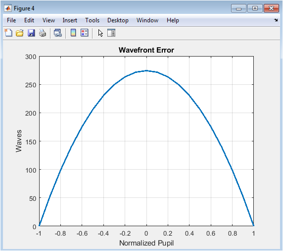 The wavefront error plot shows the deviation of the actual optical wavefront from an ideal spherical reference wavefront, measured in units of the design wavelength. This phase error across the pupil aperture fundamentally determines image quality. The characteristic shape here, with higher error at the pupil edges, indicates significant spherical aberration. The peak-to-valley and root-mean-square values quantify overall optical quality. This representation is particularly powerful because different aberration types produce characteristic wavefront shapes – spherical aberration creates a rotationally symmetric fourth-order profile, while coma produces asymmetric cubic patterns. The wavefront error directly feeds into diffraction calculations for the point spread function.