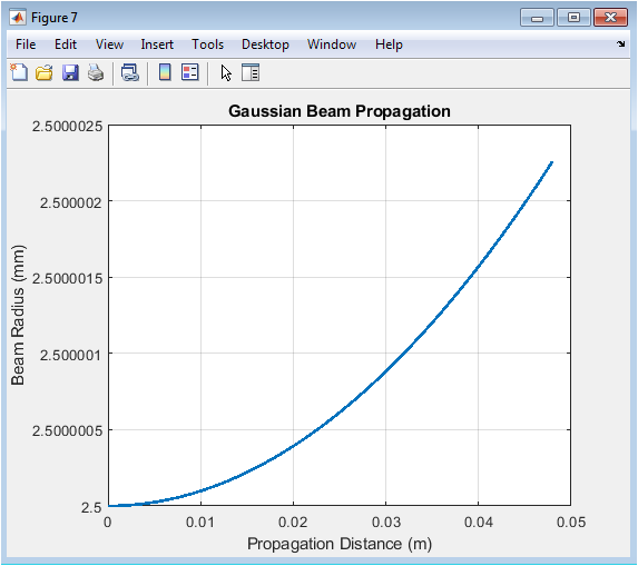 This final figure shows Gaussian beam propagation through the optical system, relevant for laser applications. The beam radius expands hyperbolically from its waist position according to the paraxial wave equation solution. The characteristic Rayleigh range marks where the beam area doubles from its minimum, defining the region of near-collimated propagation. When the beam encounters lenses, the curvature changes according to ABCD matrix transformations, effectively creating a new waist location. This analysis is crucial for laser system design, ensuring proper beam sizing at target planes and matching to other optical components. The smooth propagation curve confirms proper handling of the Gaussian beam parameters through the sequential optical system.