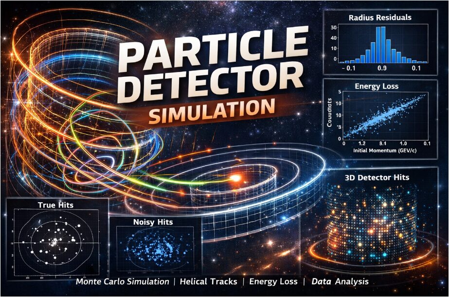 The detector response is modeled by calculating the exact intersection points where this trajectory radially intersects a series of concentric cylindrical layers; these constitute the ideal hit positions. A digitization stage then introduces realism by applying a Gaussian smearing to each hit’s spatial coordinates, simulating finite sensor resolution, and applies a stochastic, momentum-dependent energy loss as the particle traverses the detector material. The reconstruction phase groups the resulting noisy hits by particle and performs a two-dimensional pattern recognition by fitting the hits in the transverse plane to a circle using a linear least-squares algorithm, which linearizes the circle equation to solve for the center coordinates and radius [24]. Finally, an analysis module closes the loop by comparing the reconstructed track parameters to the original, known truth from the simulation. It calculates residuals to quantify spatial resolution, determines the detection efficiency from the fraction of successfully reconstructed tracks, and generates a comprehensive set of visualizations including 3D tracks, hit maps, and statistical histograms to validate each stage of the simulation workflow and assess overall performance.