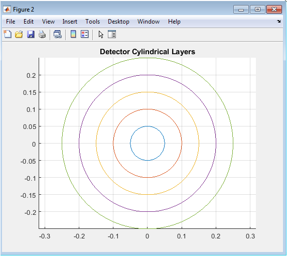Figure 3 illustrates the idealized geometry of the simulated detector. It shows a two-dimensional projection of the concentric cylindrical layers that represent the active sensor volumes. Each circle corresponds to a specific radial distance from the beam axis (the origin), defining where the simulator calculates particle intersections. This simple, nested structure is typical of barrel sections in collider experiments. The plot is crucial for understanding the spatial acceptance of the detector and provides the reference frame for all hit coordinate calculations. Its clean, geometric representation helps visualize how particles with different trajectories will sample different layers, forming the patterns that the reconstruction algorithm must later decipher.