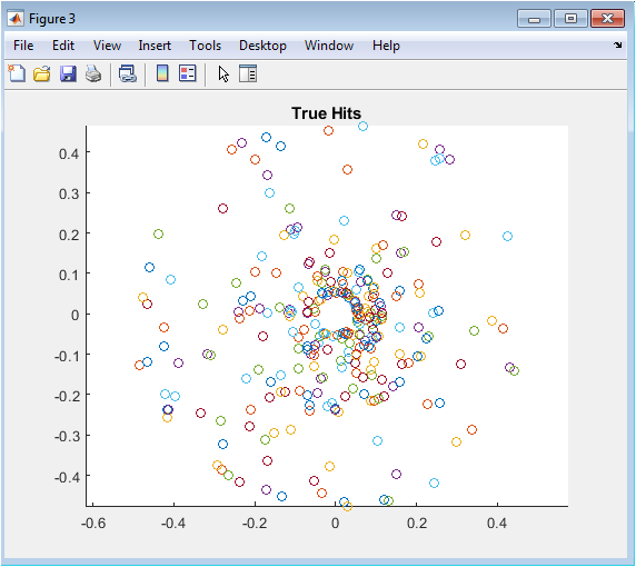 Figure 4 plots the precise, calculated points where the simulated helical trajectories intersect the detector layers, prior to the introduction of any measurement error. Each marker represents a “perfect” hit, forming clear circular arcs or segments that trace the projected path of a particle in the transverse plane. The density and pattern of these hits directly reflect the initial angular distribution of the generated particles and the curvature of their tracks. This figure represents the ideal data that would be recorded by a detector with infinite spatial resolution and perfect efficiency, serving as the direct input for the digitization stage and the reference for evaluating reconstruction accuracy.