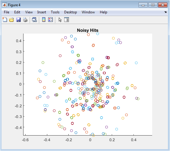 Figure 5 displays the realistic outcome of the detection process by showing the hit positions after the application of Gaussian smearing. Compared to Figure 3, the hits are scattered around their true positions, mimicking the finite spatial resolution of real silicon sensors or wire chambers. This noise obscures the clean geometric patterns, introducing the fundamental challenge of pattern recognition. The spread of points visually demonstrates the effect of the `sigma_hit` parameter, and the plot is essential for understanding the quality of the raw “data” that the reconstruction algorithm must process to recover the underlying particle tracks.